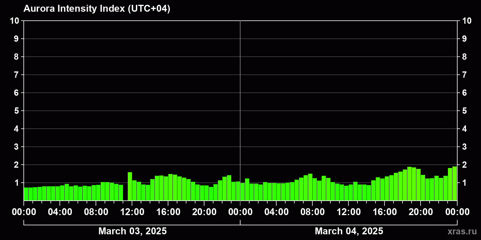 Auroral intensity index and the theoretically possible latitude of observations for nighttime in the Estern Hemisphere as of 2025-03-04 23:45 (end of day) local time
