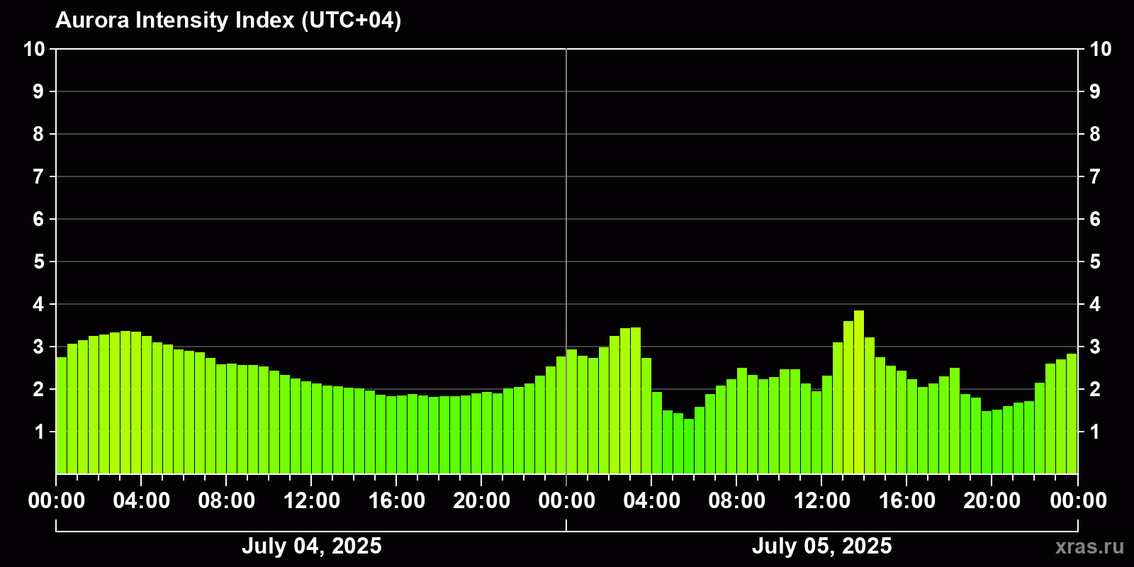 Changes in the auroral intensity index from 2025-07-04 to 2025-07-05 local time