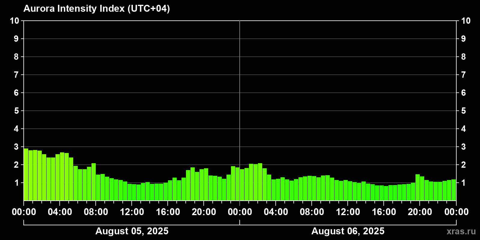 Changes in the auroral intensity index from 2025-08-05 to 2025-08-06 local time