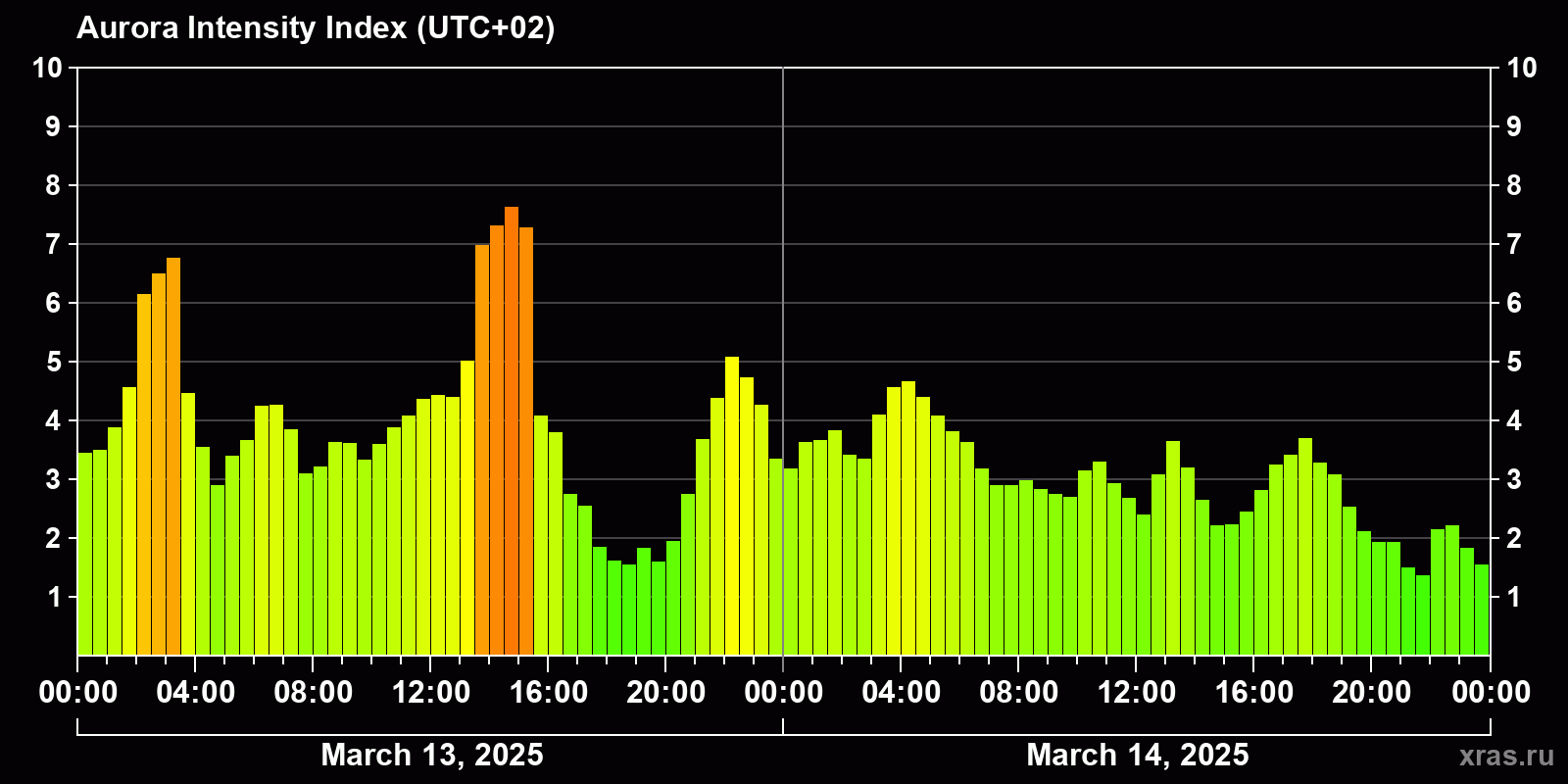 Changes in the auroral intensity index from 2025-03-13 to 2025-03-14 local time