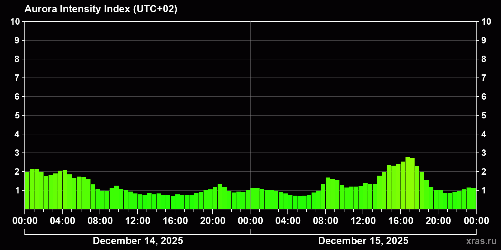 Changes in the auroral intensity index from 2025-12-14 to 2025-12-15 local time