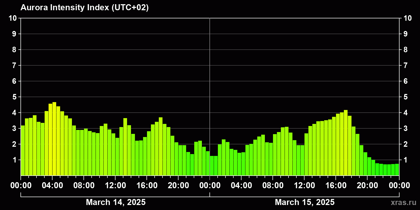 Auroral intensity index and the theoretically possible latitude of observations for nighttime in the Estern Hemisphere as of 2025-03-15 23:52 (end of day) local time
