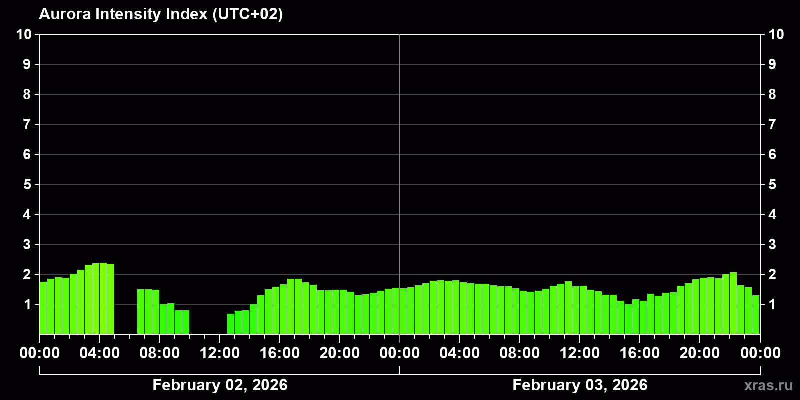 Changes in the auroral intensity index from 2026-02-02 to 2026-02-03 local time