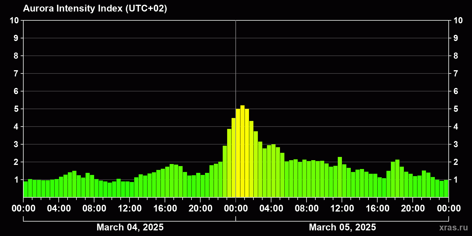 Changes in the auroral intensity index from 2025-03-04 to 2025-03-05 local time