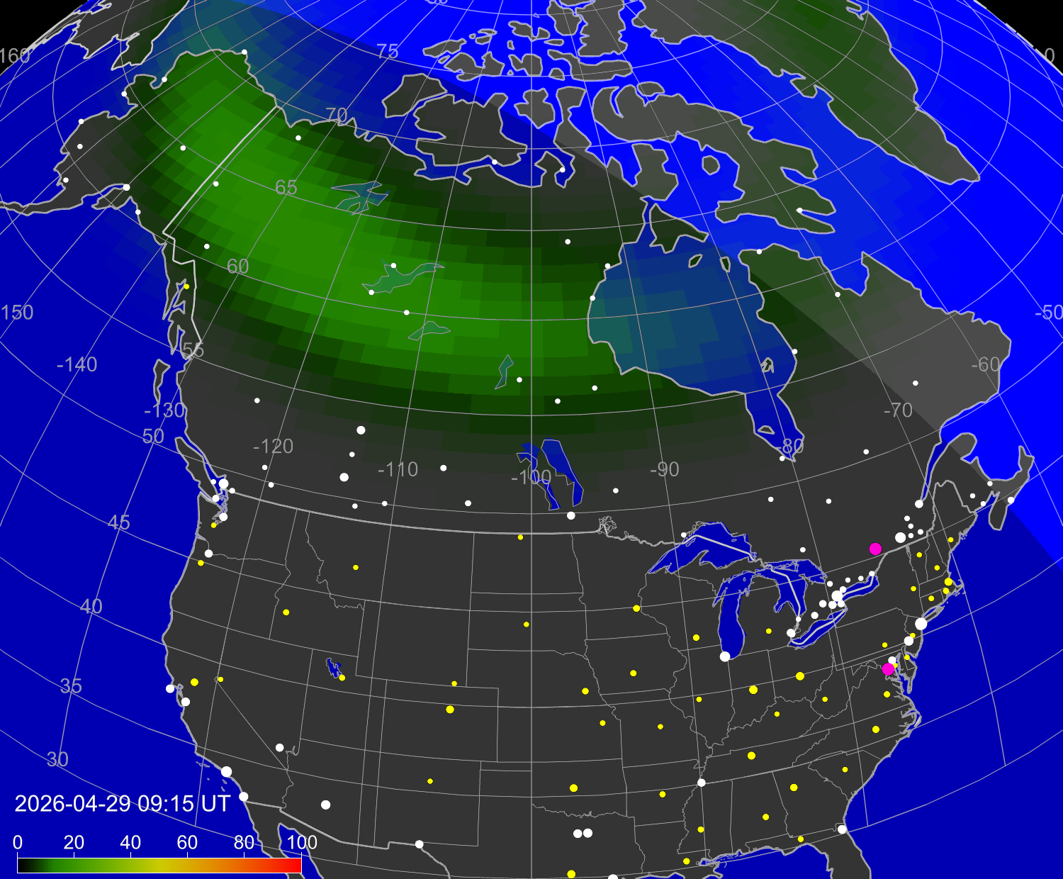 Auroral intensity index and theoretically possible latitude of observations for nighttime in the Western Hemisphere