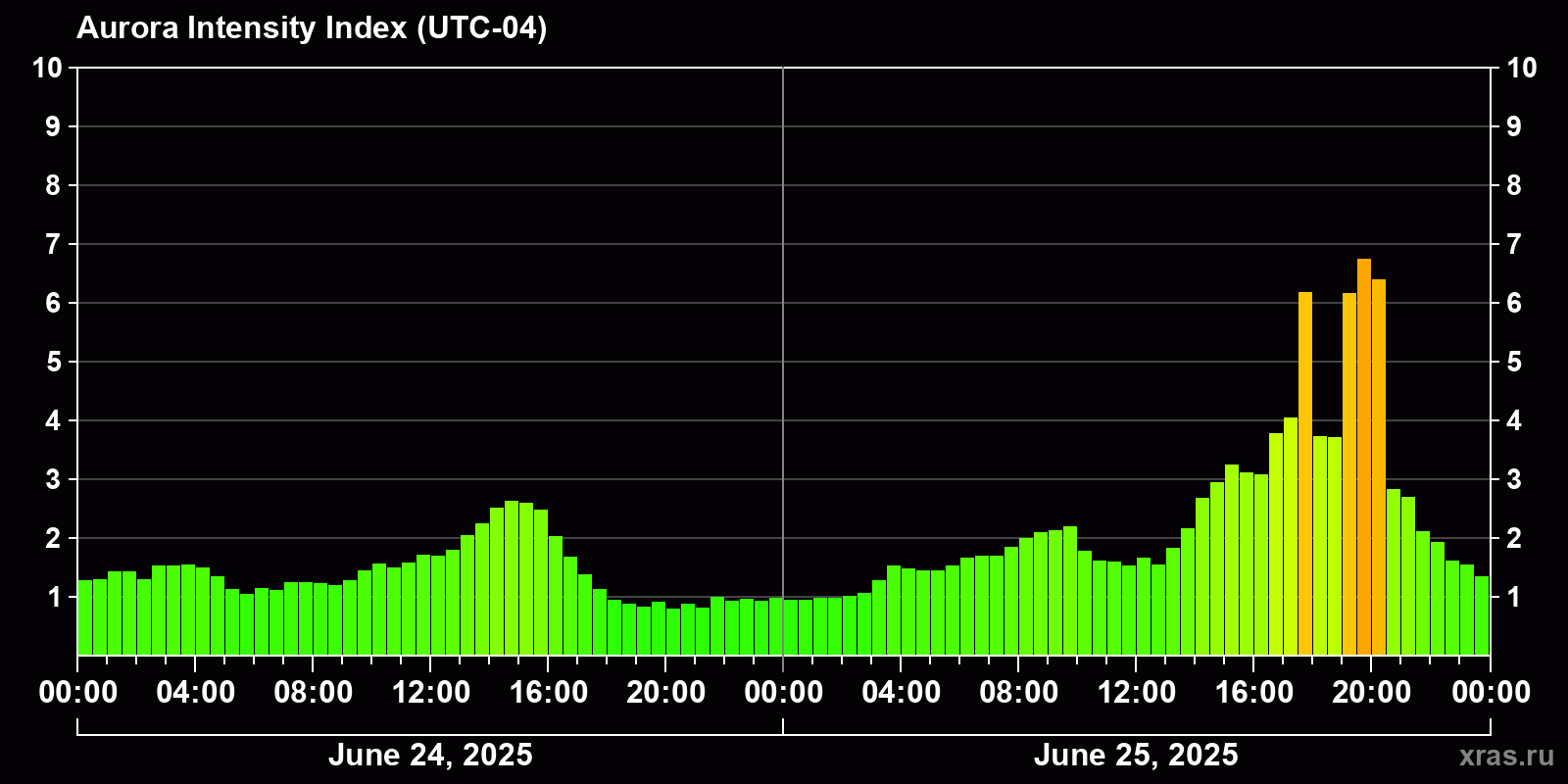 Auroral intensity index and the theoretically possible latitude of observations for nighttime in the Western Hemisphere as of 2025-06-25 23:58 (end of day) local time