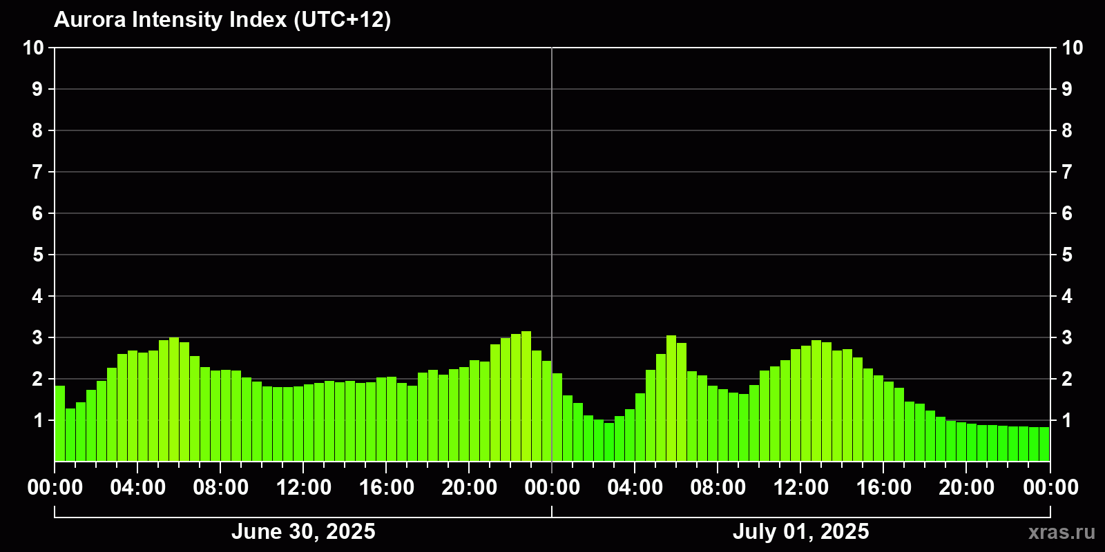 Auroral intensity index and the theoretically possible latitude of observations for nighttime in the Western Hemisphere as of 2025-07-02 00:47 (end of day) local time