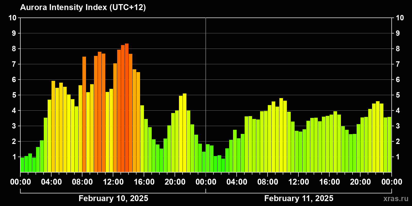Changes in the auroral intensity index from 2025-02-10 to 2025-02-11 local time