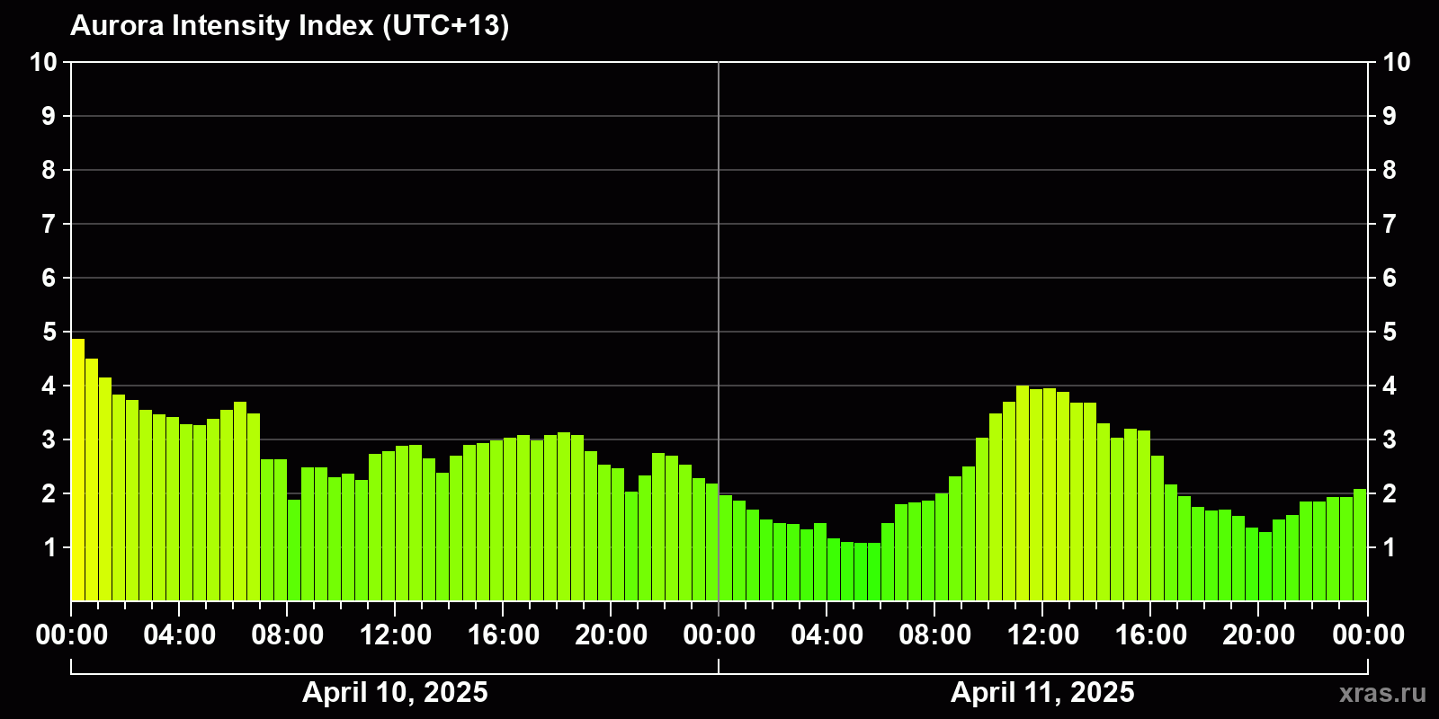 Changes in the auroral intensity index from 2025-04-10 to 2025-04-11 local time