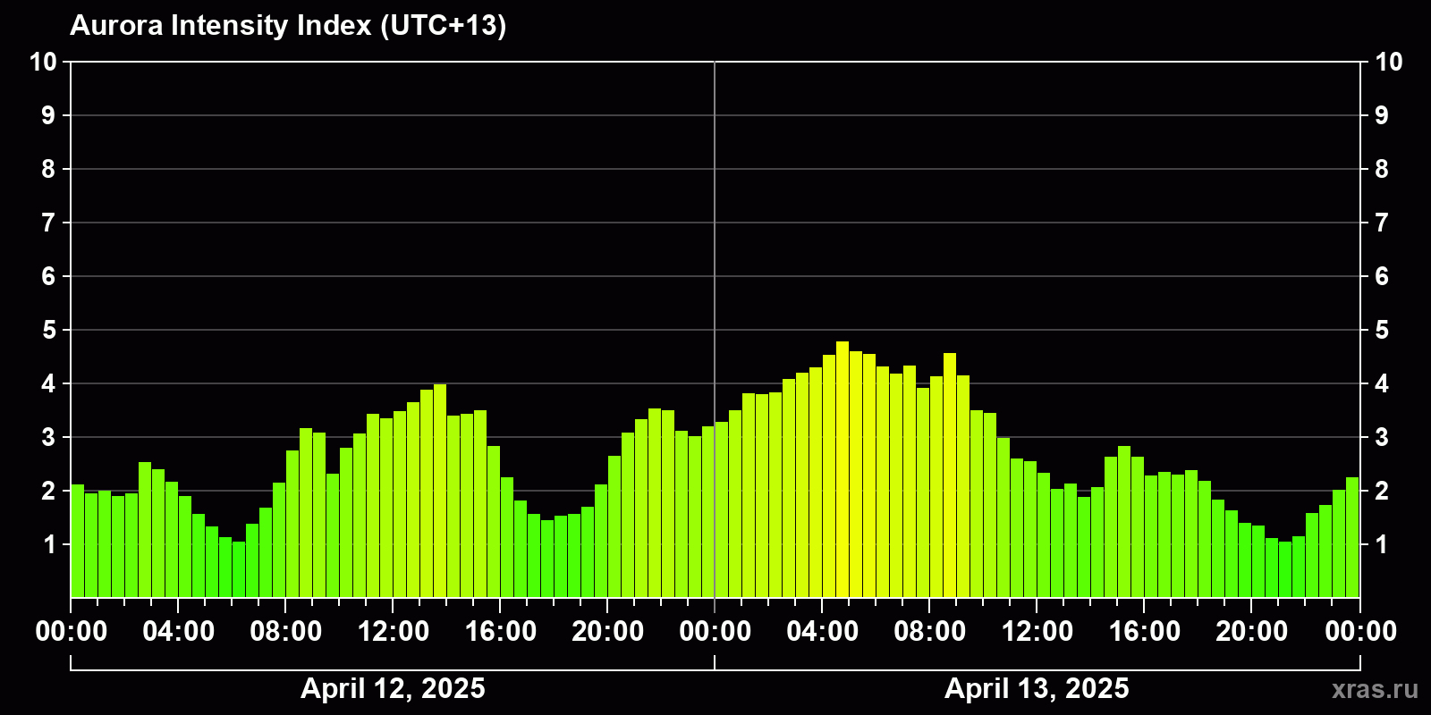 Changes in the auroral intensity index from 2025-04-12 to 2025-04-13 local time