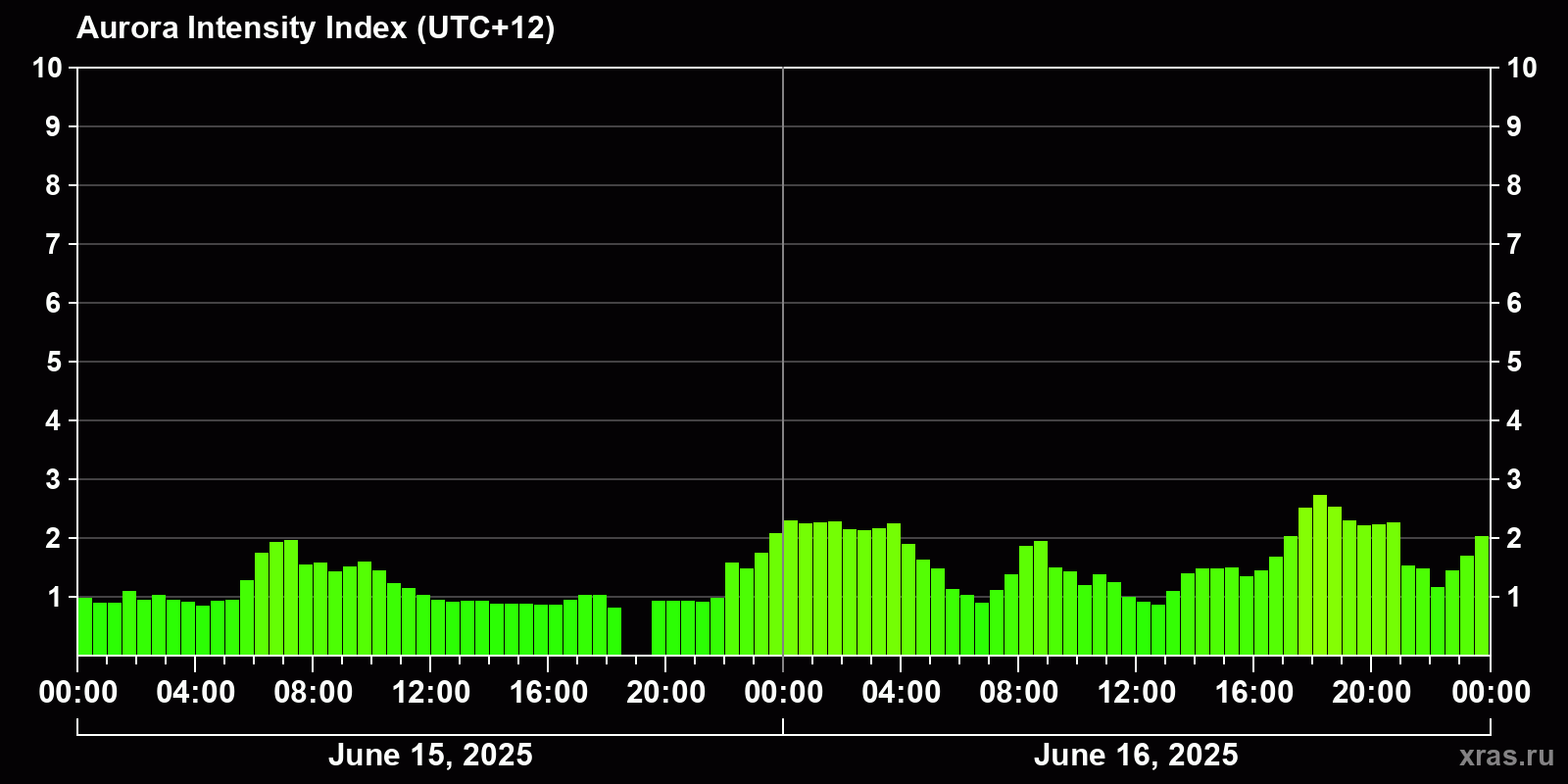 Changes in the auroral intensity index from 2025-06-16 to 2025-06-17 local time