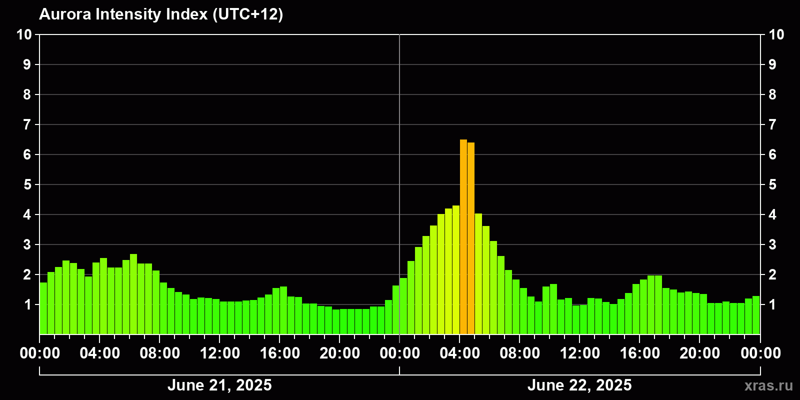 Changes in the auroral intensity index from 2025-06-21 to 2025-06-22 local time