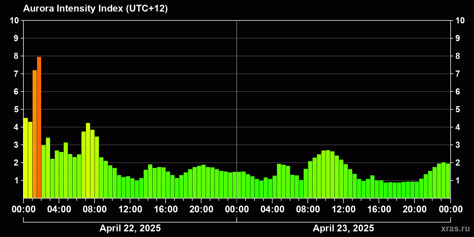 Changes in the auroral intensity index from 2025-04-23 to 2025-04-24 local time