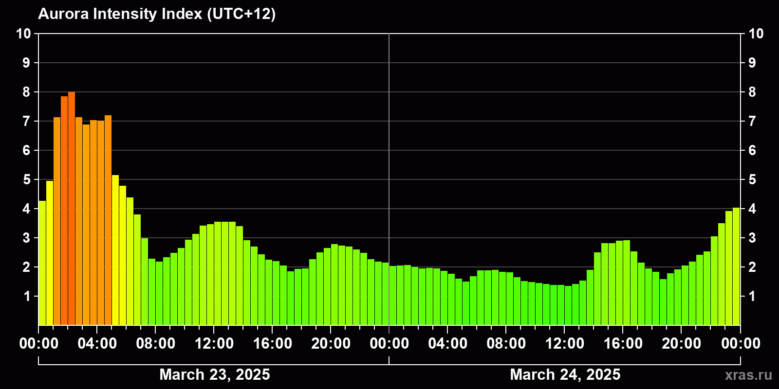Changes in the auroral intensity index from 2025-03-23 to 2025-03-24 local time