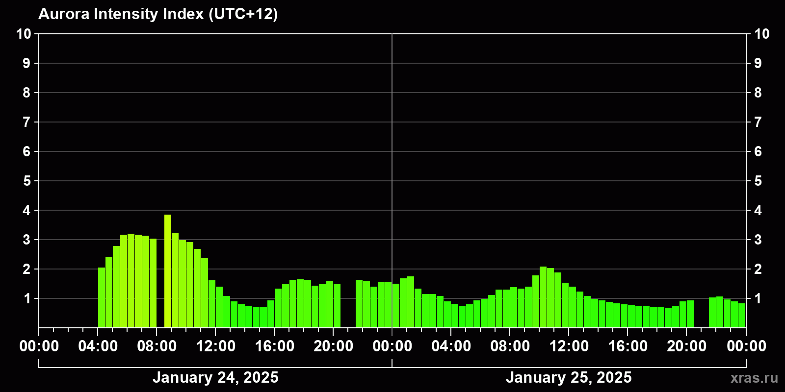 Changes in the auroral intensity index from 2025-01-24 to 2025-01-25 local time