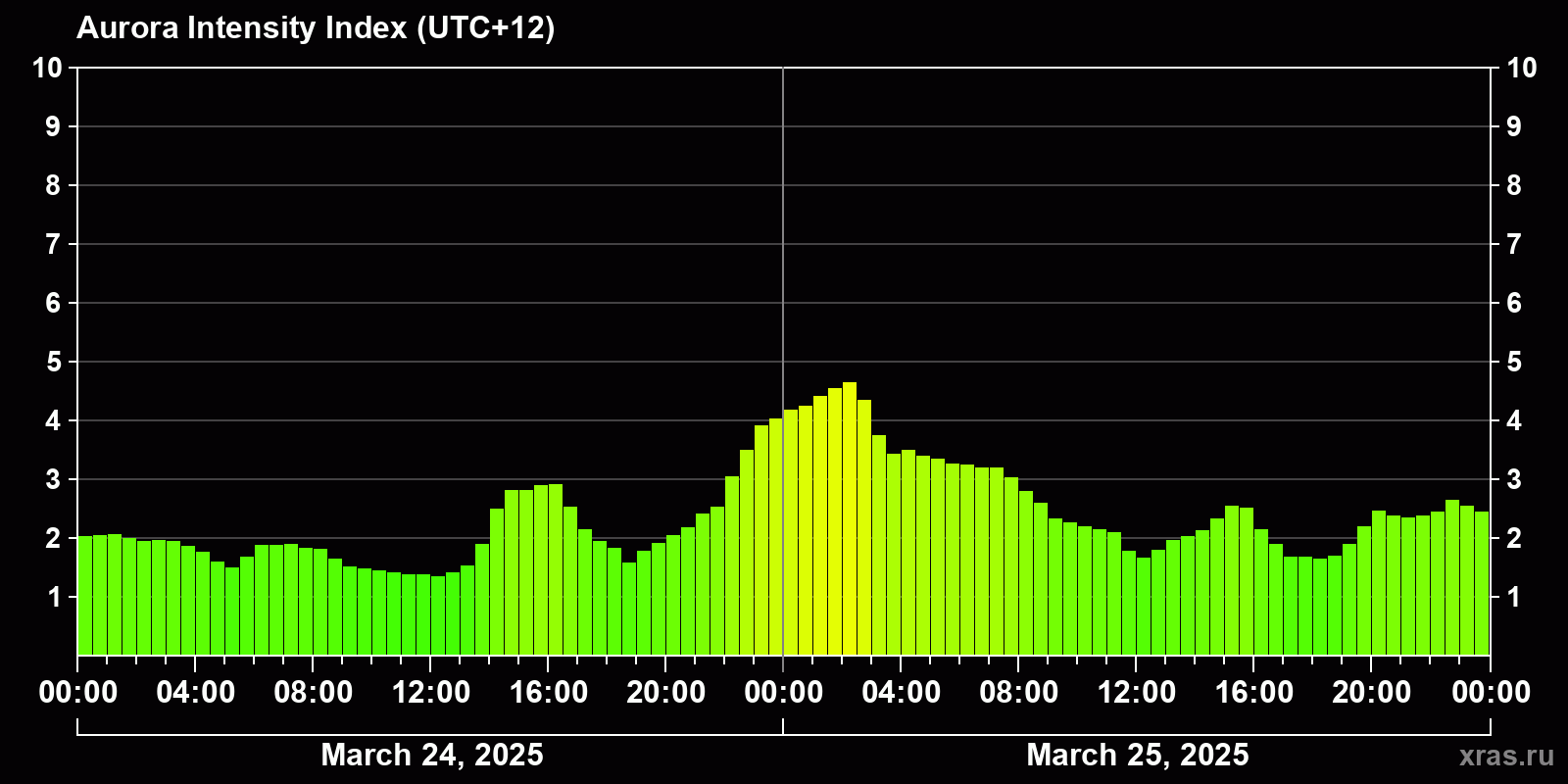 Changes in the auroral intensity index from 2025-03-24 to 2025-03-25 local time