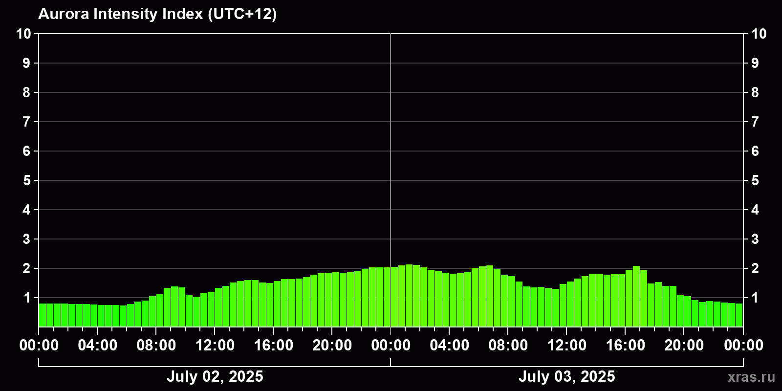Changes in the auroral intensity index from 2025-07-03 to 2025-07-04 local time