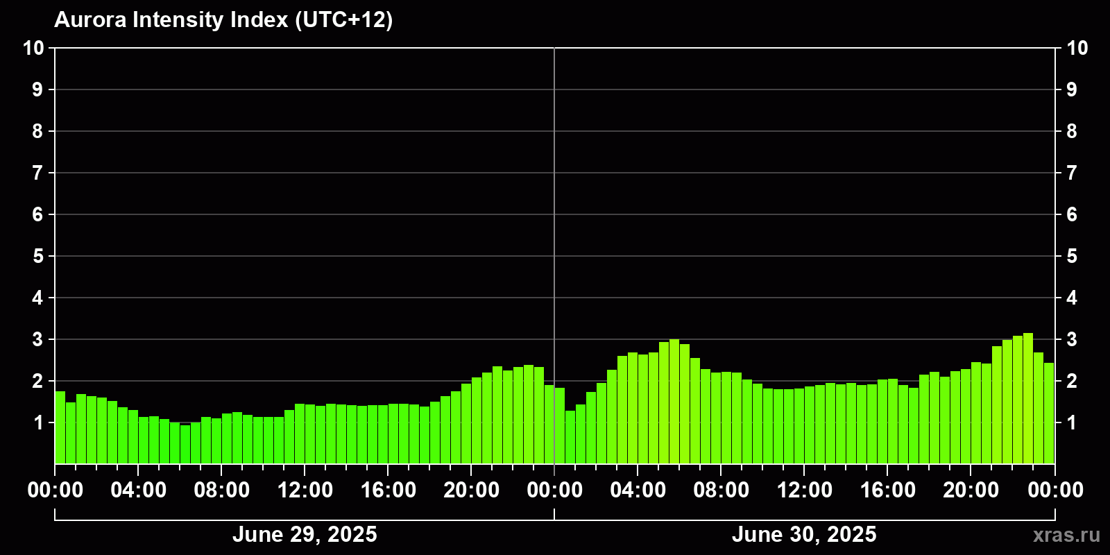 Changes in the auroral intensity index from 2025-06-30 to 2025-07-01 local time