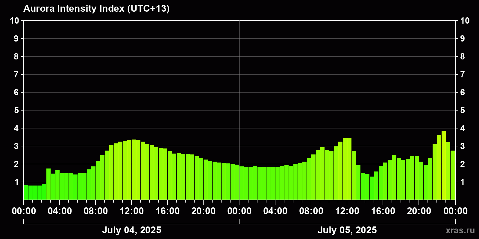 Changes in the auroral intensity index from 2025-07-04 to 2025-07-05 local time