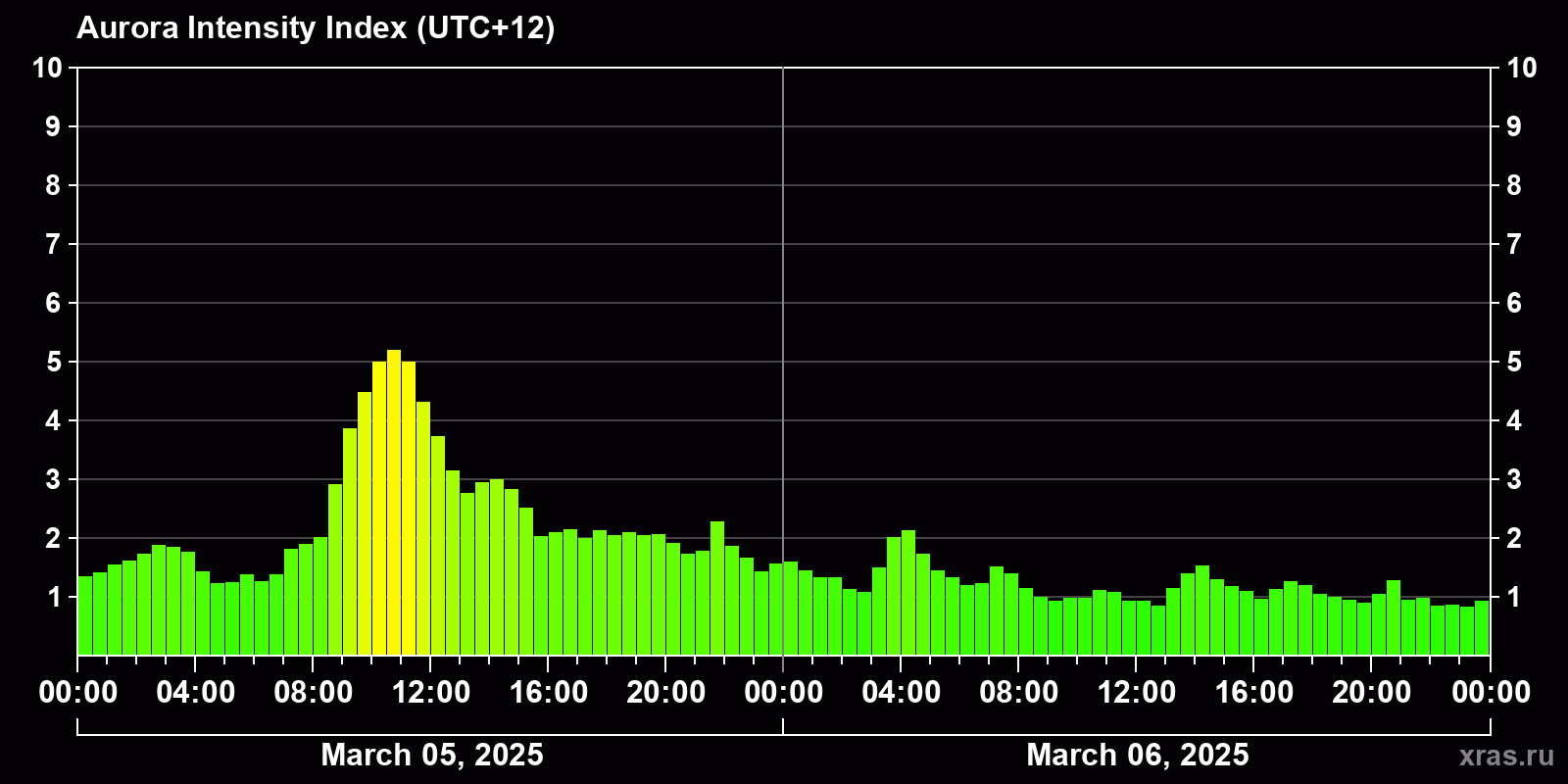 Changes in the auroral intensity index from 2025-03-05 to 2025-03-06 local time