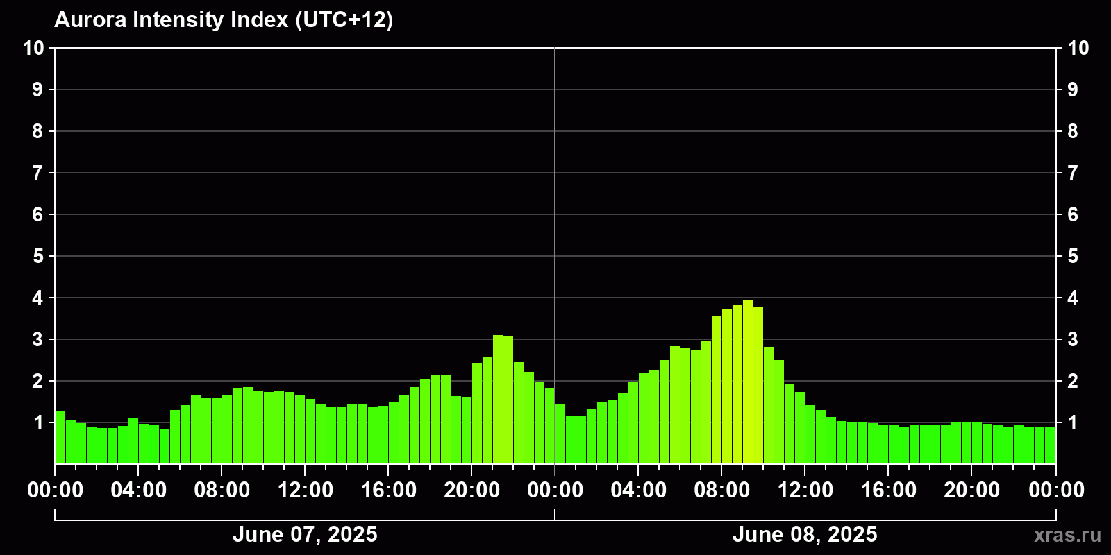 Changes in the auroral intensity index from 2025-06-08 to 2025-06-09 local time
