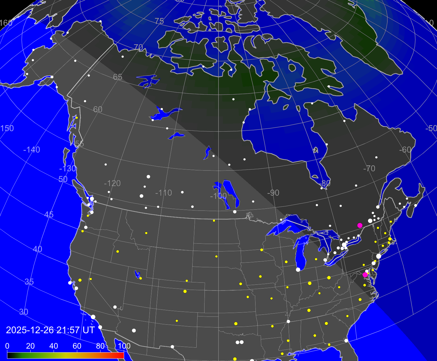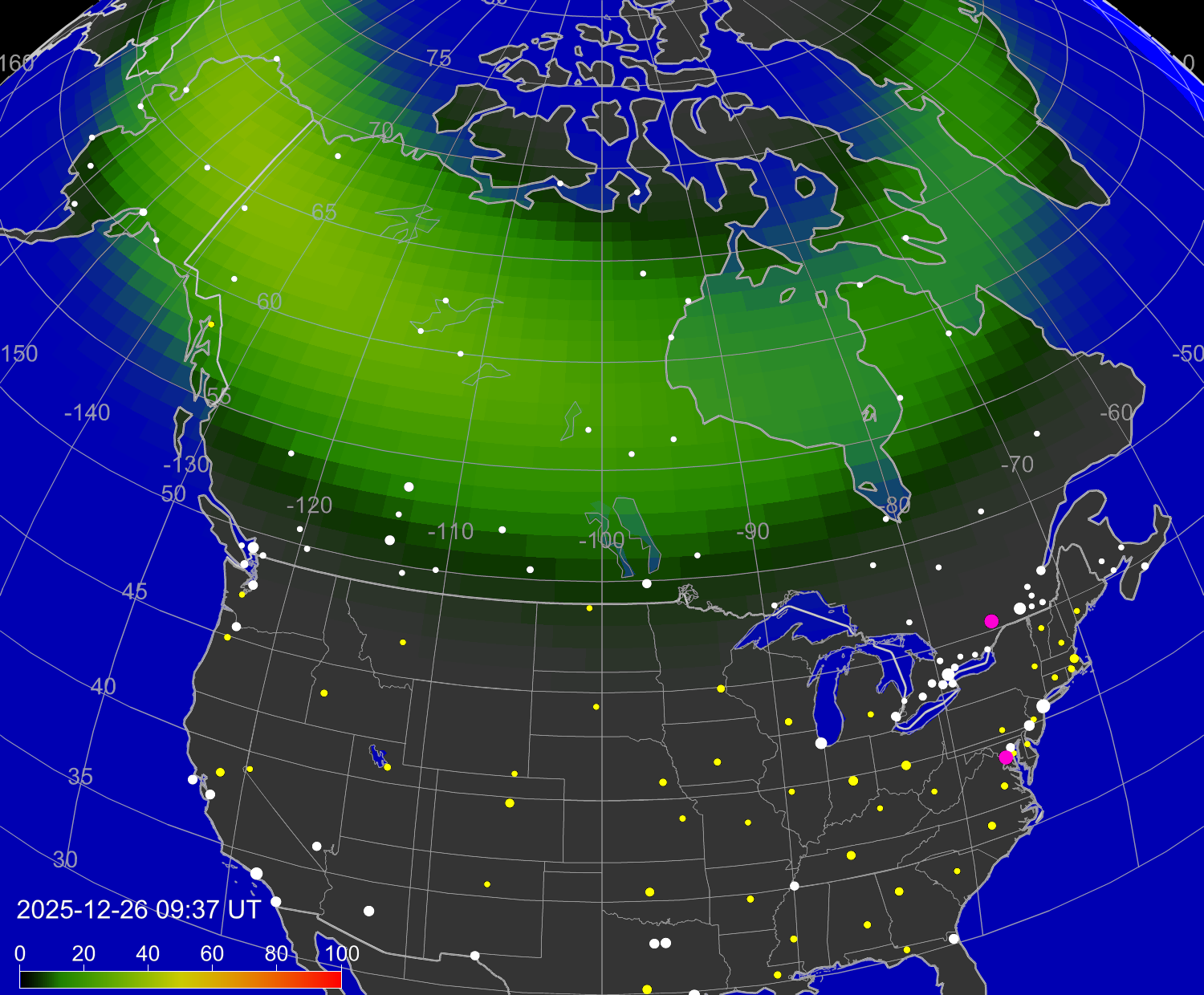 Индекс интенсивности полярных сияний и теоретически возможная широта наблюдений для ночного времени в западном полушарии