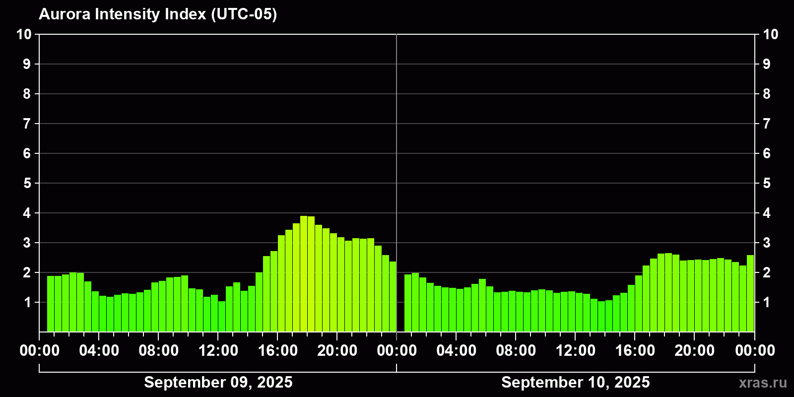 Auroral intensity index and the theoretically possible latitude of observations for nighttime in the Western Hemisphere as of 2025-09-10 23:48 (end of day) local time