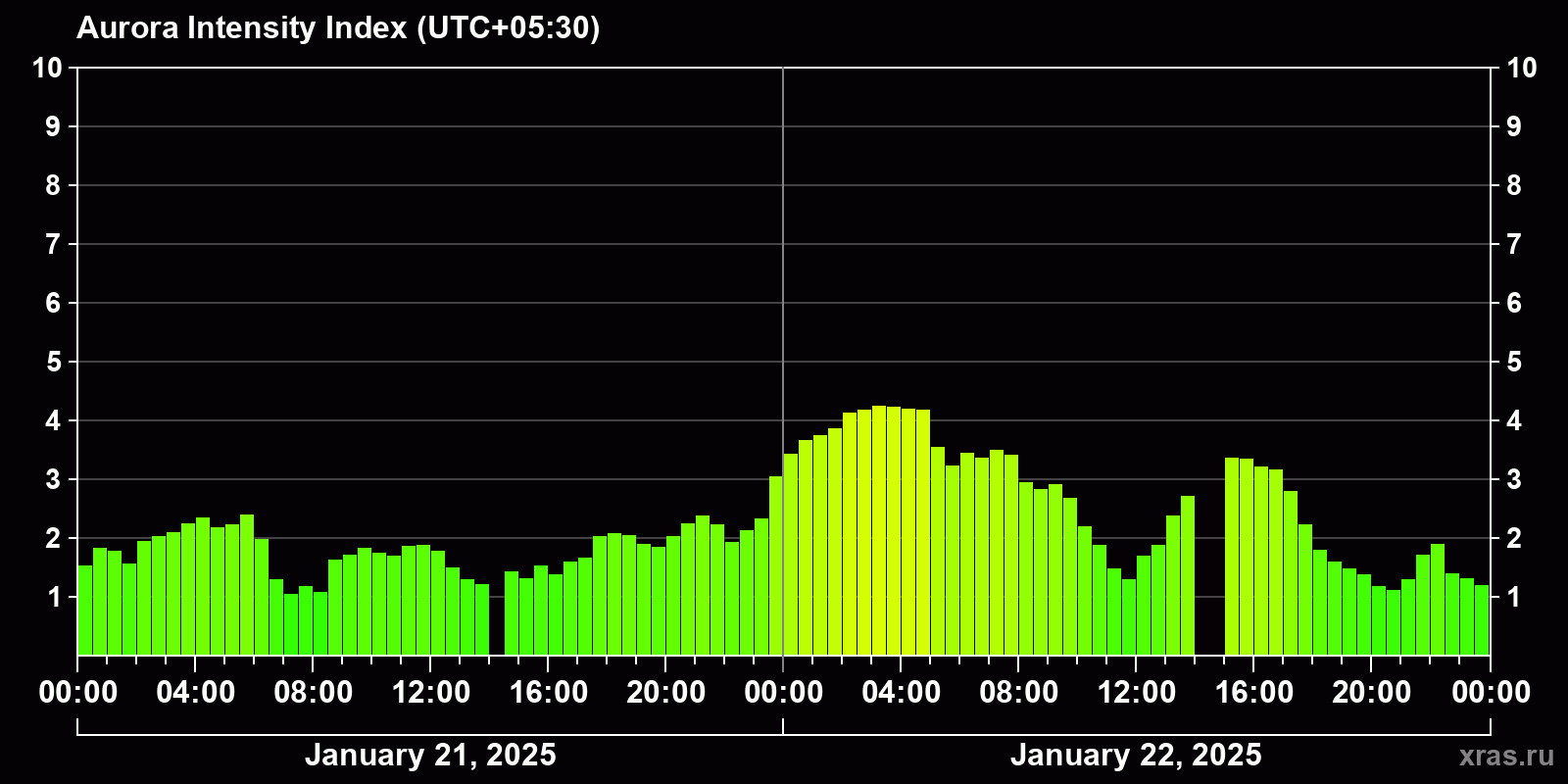 Auroral intensity index and the theoretically possible latitude of observations for nighttime in the Estern Hemisphere as of 2025-01-22 23:35 (end of day) local time