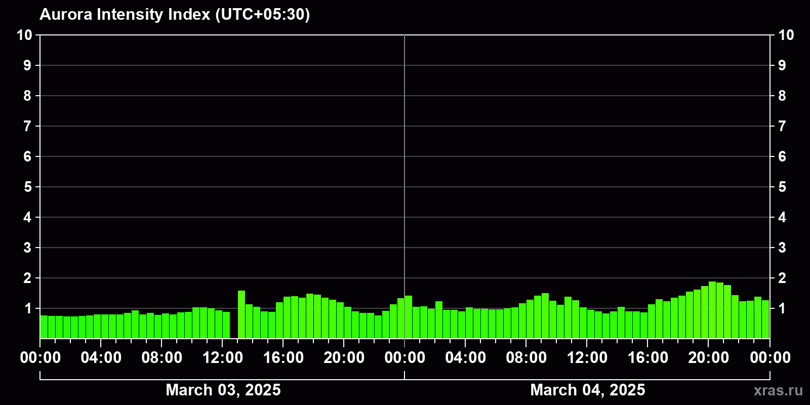 Changes in the auroral intensity index from 2025-03-03 to 2025-03-04 local time