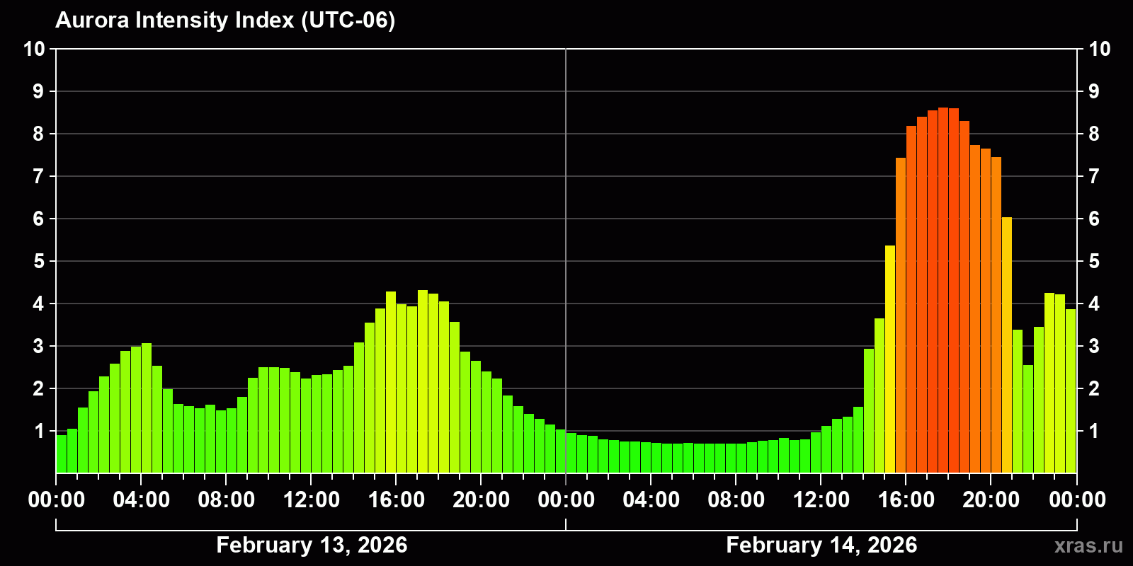 Auroral intensity index and the theoretically possible latitude of observations for nighttime in the Western Hemisphere as of 2026-02-14 23:54 (end of day) local time