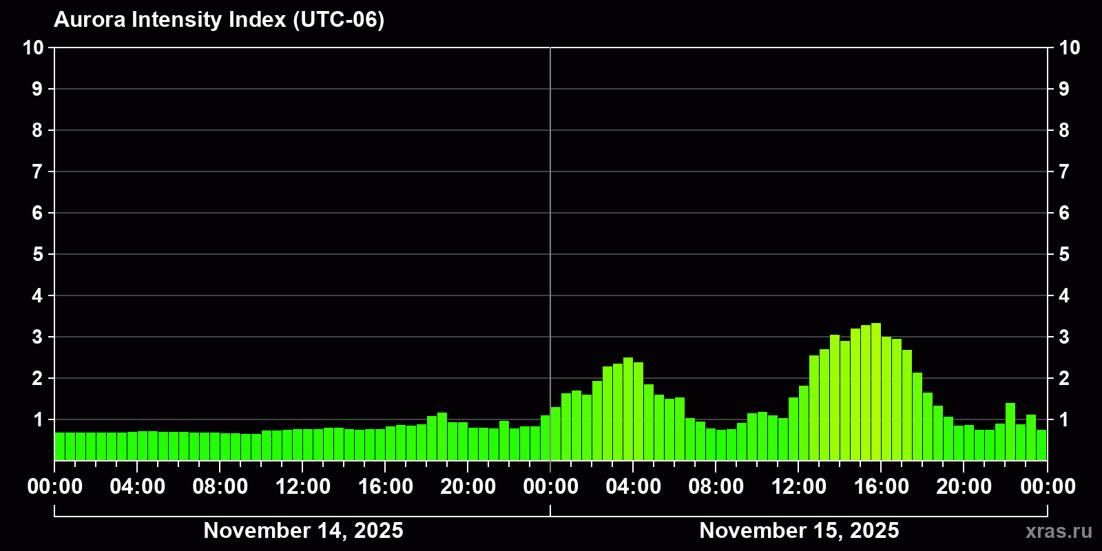 Changes in the auroral intensity index from 2025-11-14 to 2025-11-15 local time
