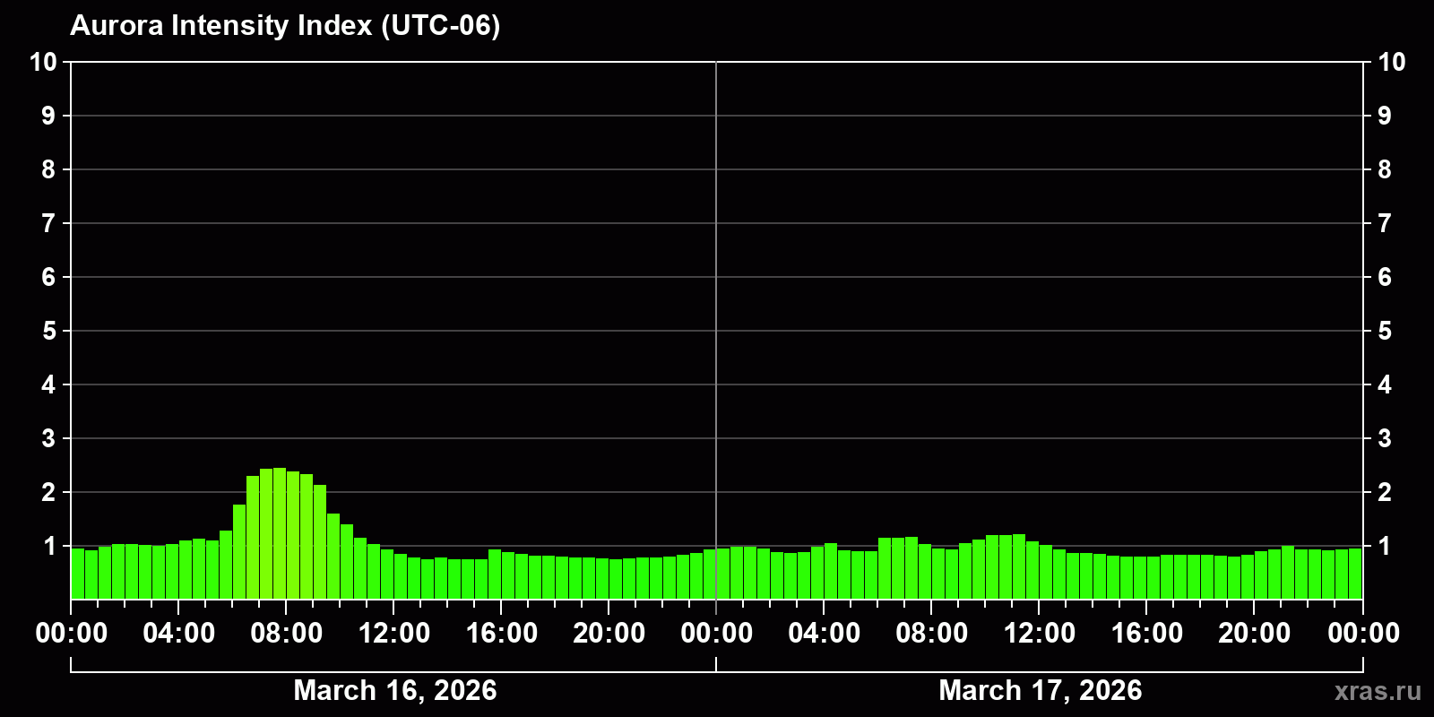 Changes in the auroral intensity index from 2026-03-16 to 2026-03-17 local time