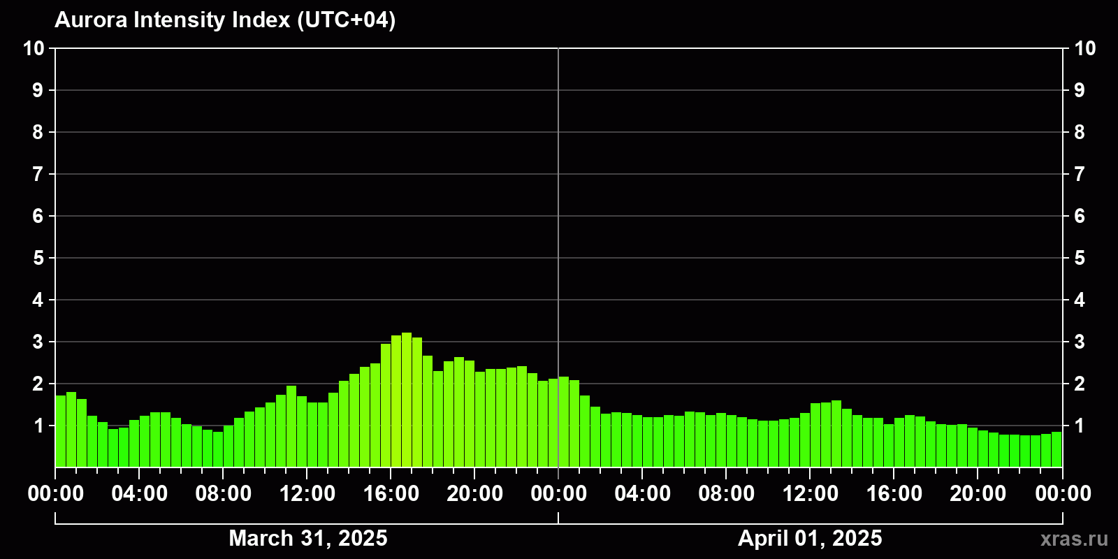 Auroral intensity index and the theoretically possible latitude of observations for nighttime in the Estern Hemisphere as of 2025-04-02 00:55 (end of day) local time