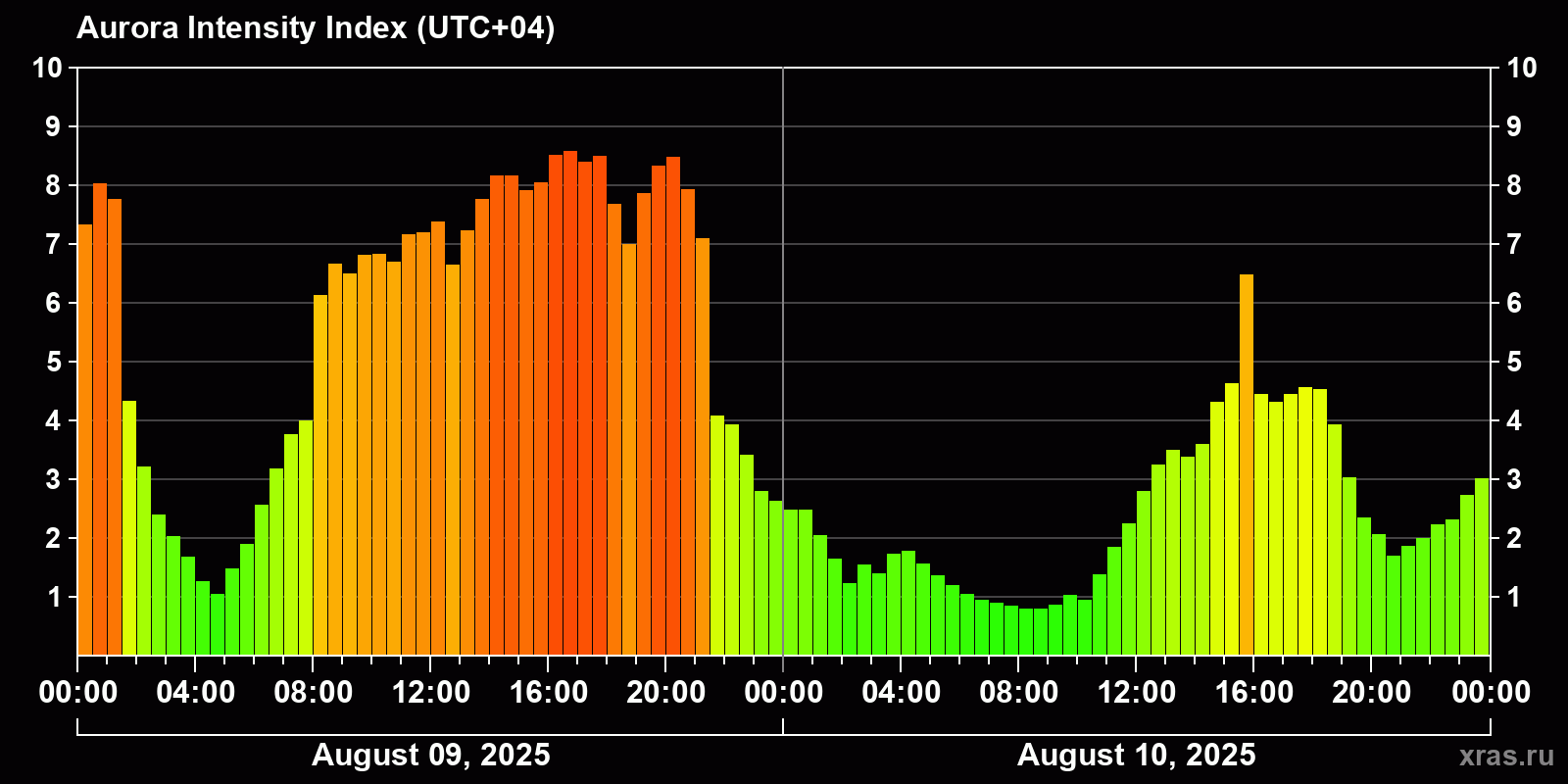Auroral intensity index and the theoretically possible latitude of observations for nighttime in the Estern Hemisphere as of 2025-08-10 23:45 (end of day) local time