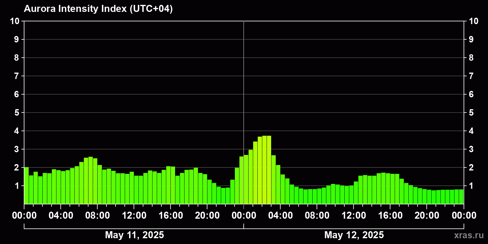 Auroral intensity index and the theoretically possible latitude of observations for nighttime in the Estern Hemisphere as of 2025-05-13 00:59 (end of day) local time