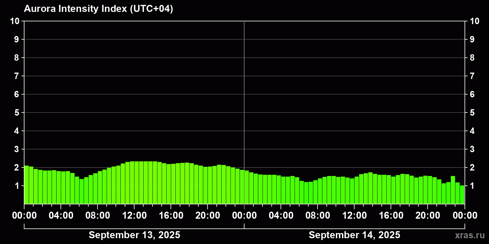 Auroral intensity index and the theoretically possible latitude of observations for nighttime in the Estern Hemisphere as of 2025-09-15 00:51 (end of day) local time