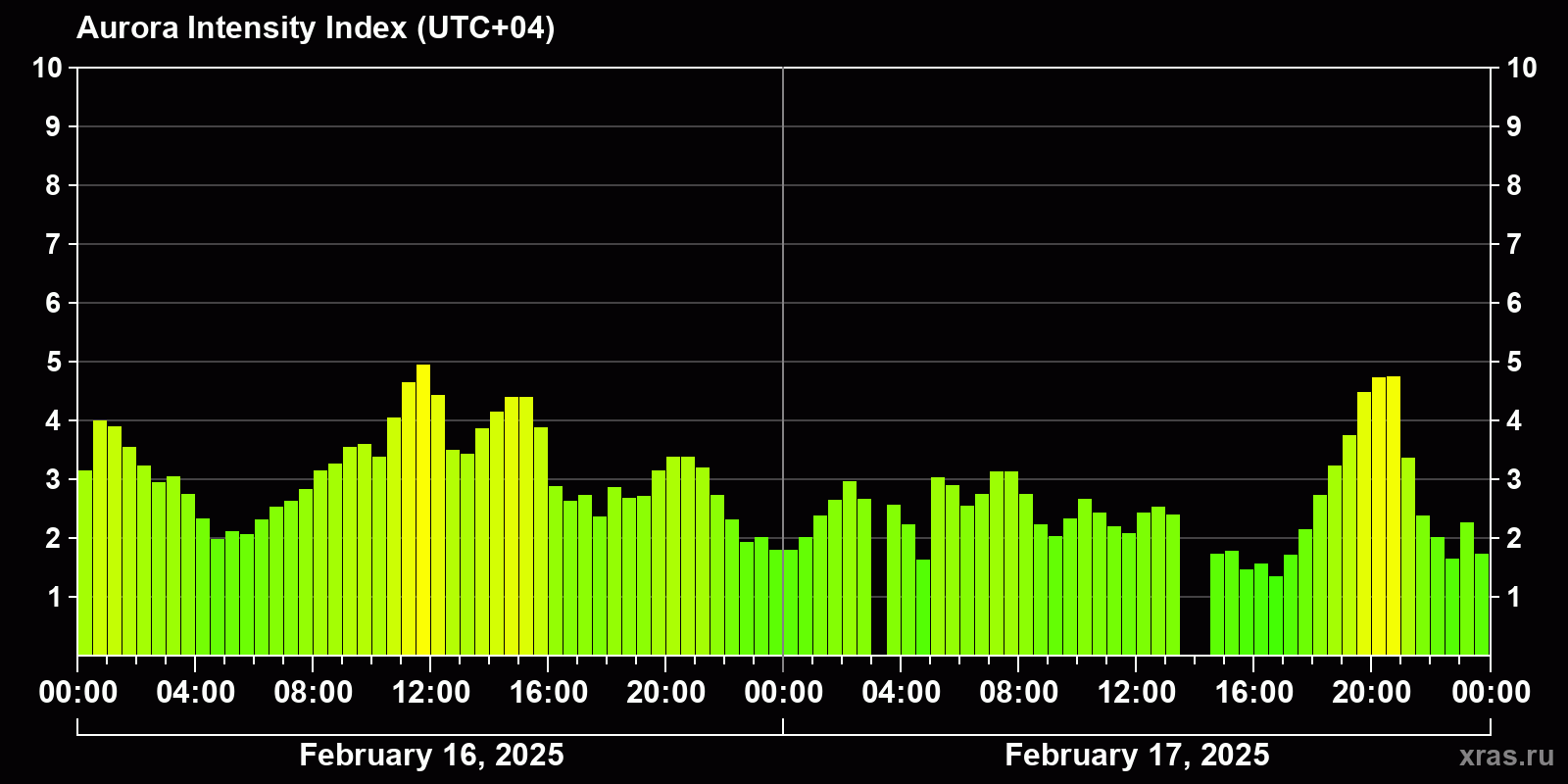 Auroral intensity index and the theoretically possible latitude of observations for nighttime in the Estern Hemisphere as of 2025-02-17 23:52 (end of day) local time