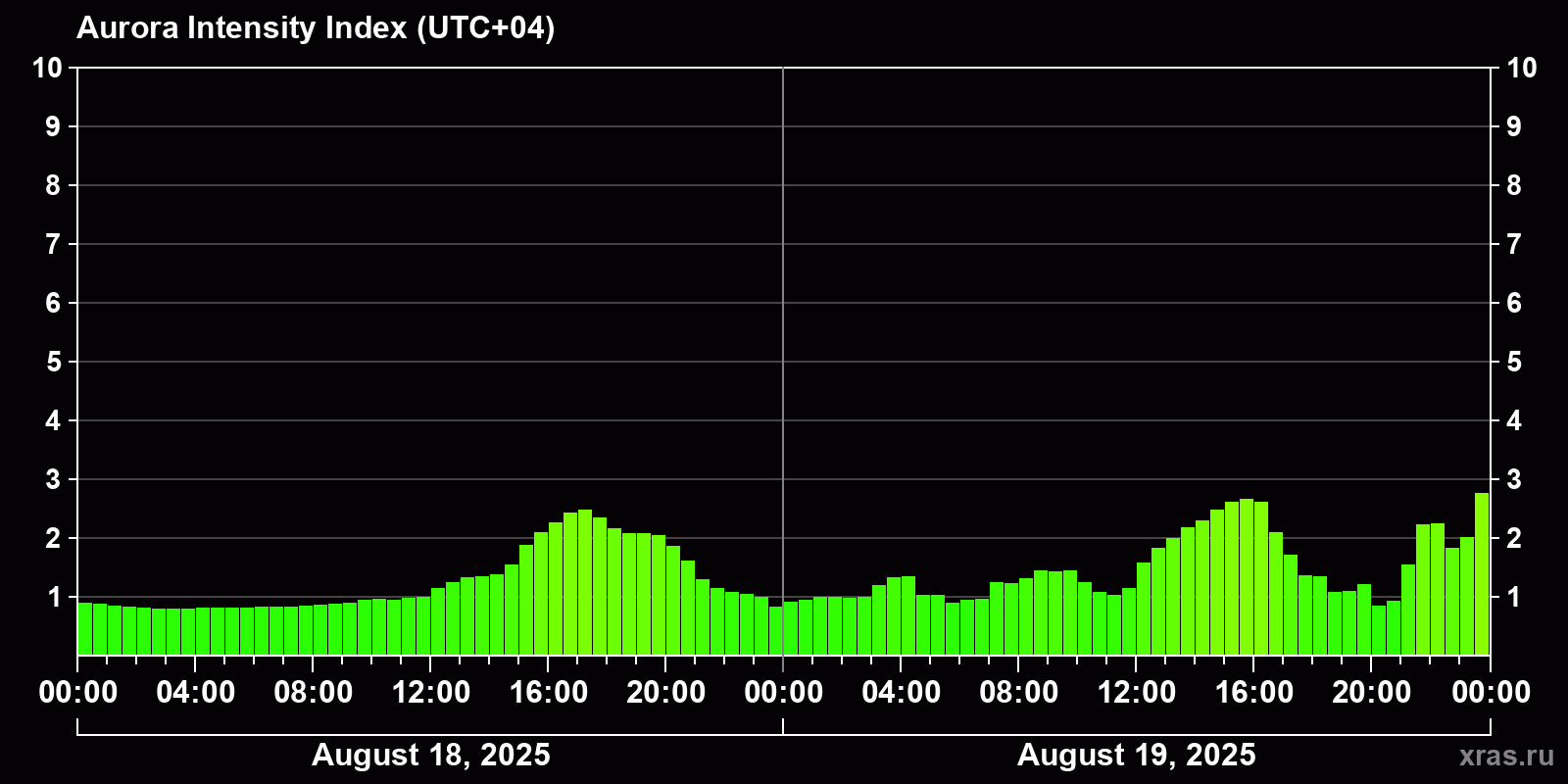 Auroral intensity index and the theoretically possible latitude of observations for nighttime in the Estern Hemisphere as of 2025-08-20 00:45 (end of day) local time