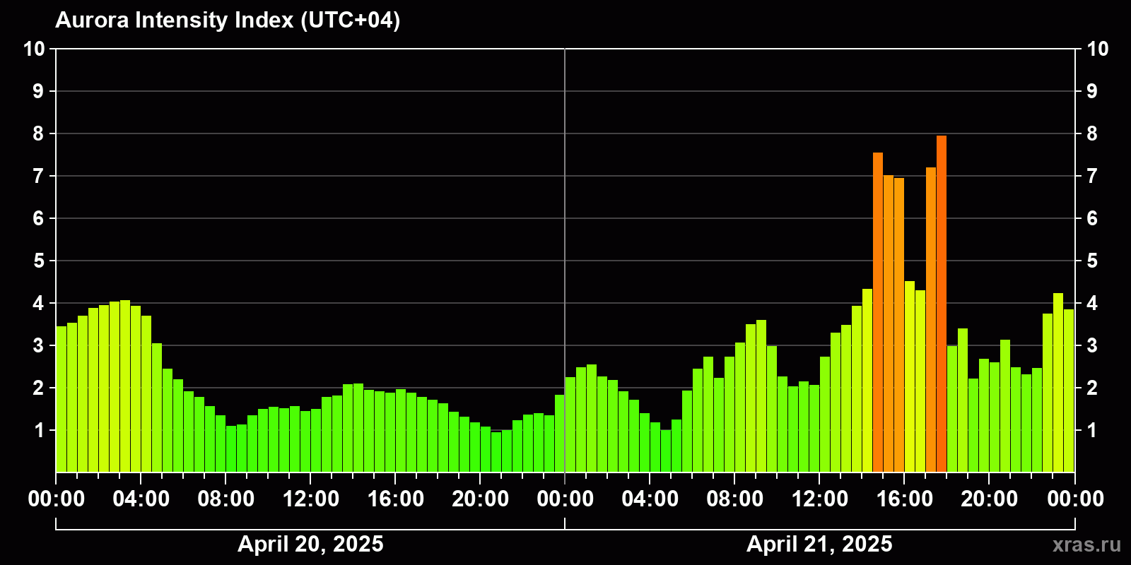 Changes in the auroral intensity index from 2025-04-21 to 2025-04-22 local time