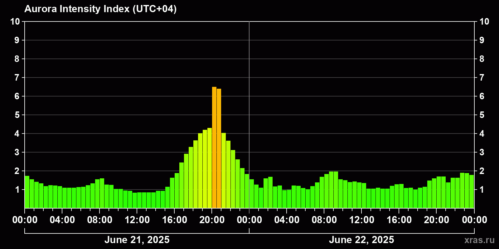 Auroral intensity index and the theoretically possible latitude of observations for nighttime in the Estern Hemisphere as of 2025-06-23 00:51 (end of day) local time