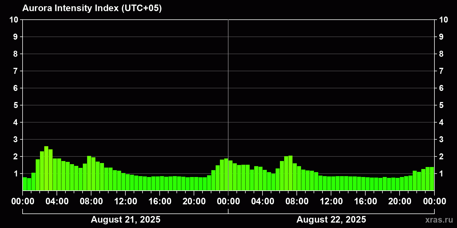 Auroral intensity index and the theoretically possible latitude of observations for nighttime in the Estern Hemisphere as of 2025-08-23 00:48 (end of day) local time