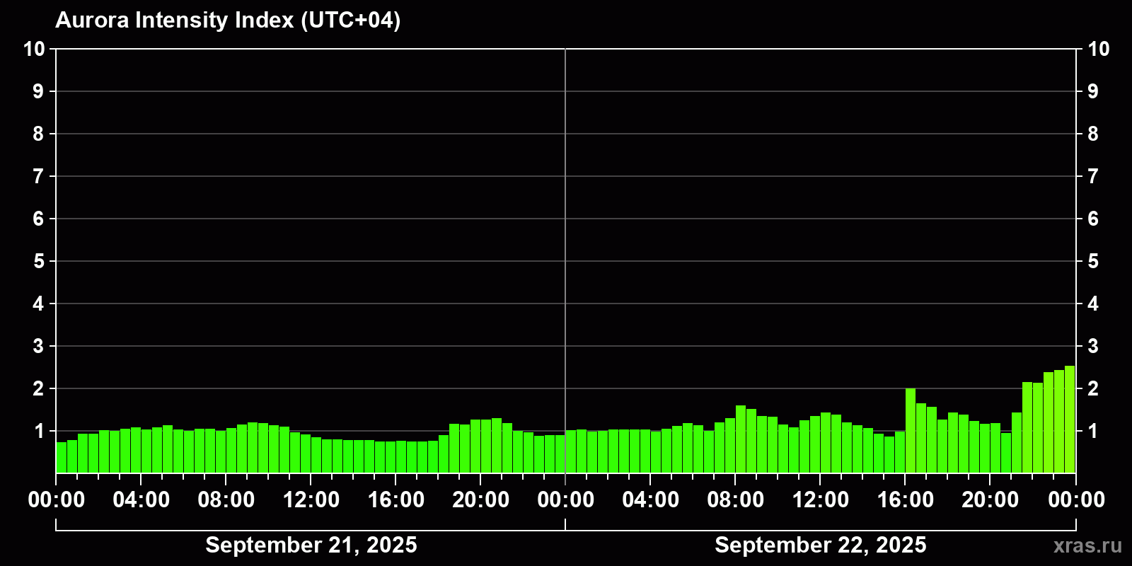 Auroral intensity index and the theoretically possible latitude of observations for nighttime in the Estern Hemisphere as of 2025-09-22 23:49 (end of day) local time