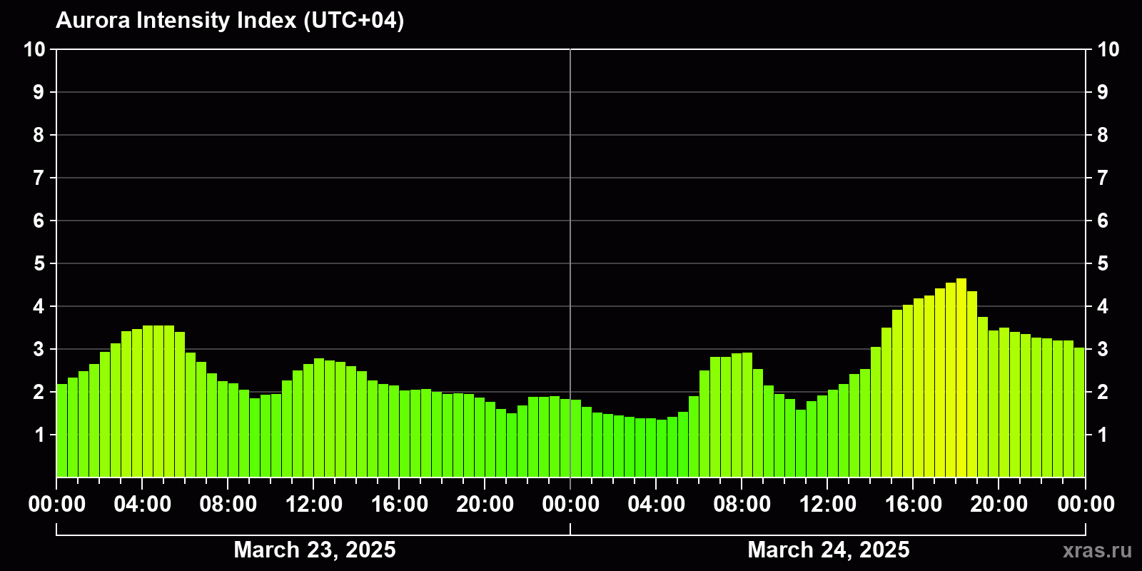 Auroral intensity index and the theoretically possible latitude of observations for nighttime in the Estern Hemisphere as of 2025-03-24 23:46 (end of day) local time