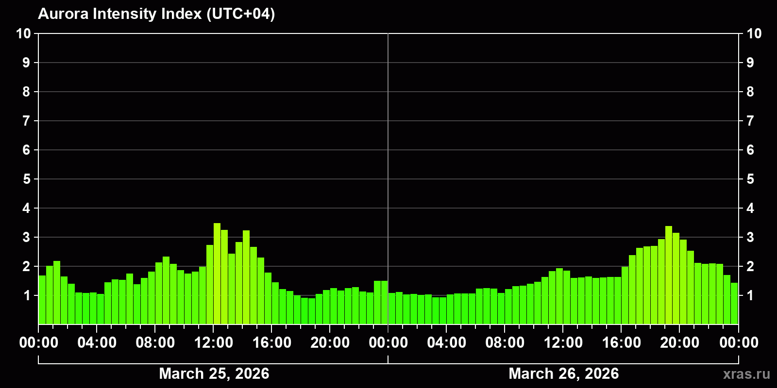Changes in the auroral intensity index from 2026-03-25 to 2026-03-26 local time