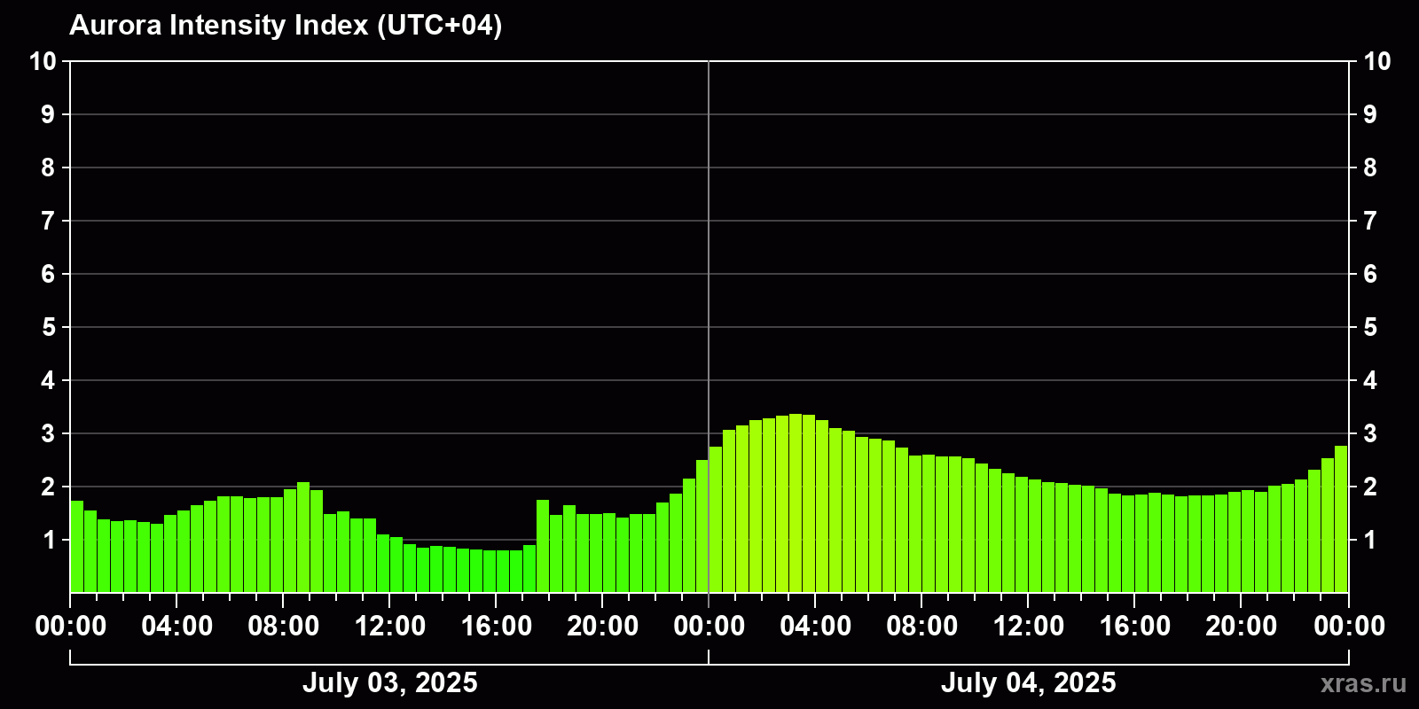 Auroral intensity index and the theoretically possible latitude of observations for nighttime in the Estern Hemisphere as of 2025-07-05 00:47 (end of day) local time