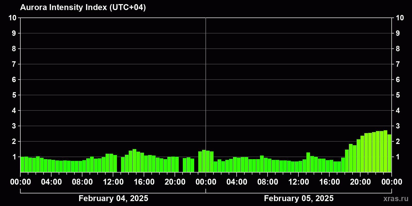 Auroral intensity index and the theoretically possible latitude of observations for nighttime in the Estern Hemisphere as of 2025-02-05 23:51 (end of day) local time