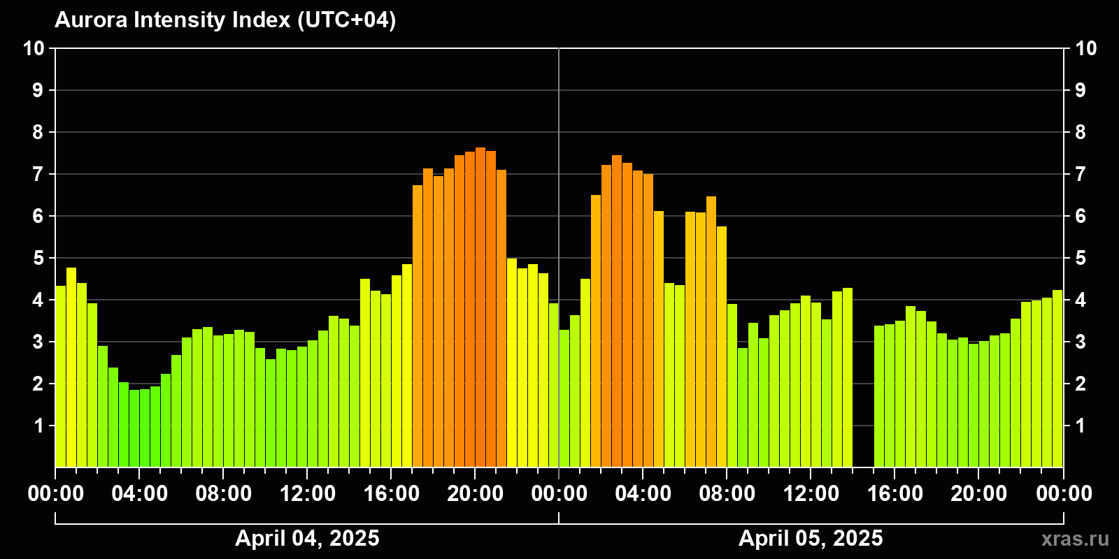 Auroral intensity index and the theoretically possible latitude of observations for nighttime in the Estern Hemisphere as of 2025-04-06 00:47 (end of day) local time
