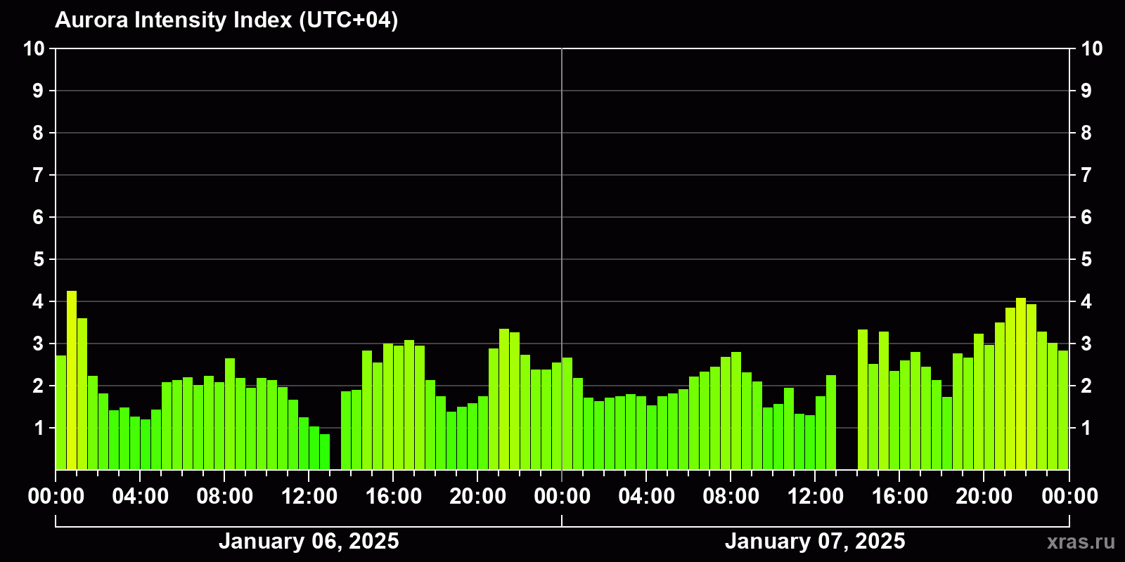 Auroral intensity index and the theoretically possible latitude of observations for nighttime in the Estern Hemisphere as of 2025-01-07 23:58 (end of day) local time