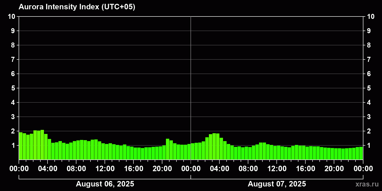 Auroral intensity index and the theoretically possible latitude of observations for nighttime in the Estern Hemisphere as of 2025-08-07 23:57 (end of day) local time