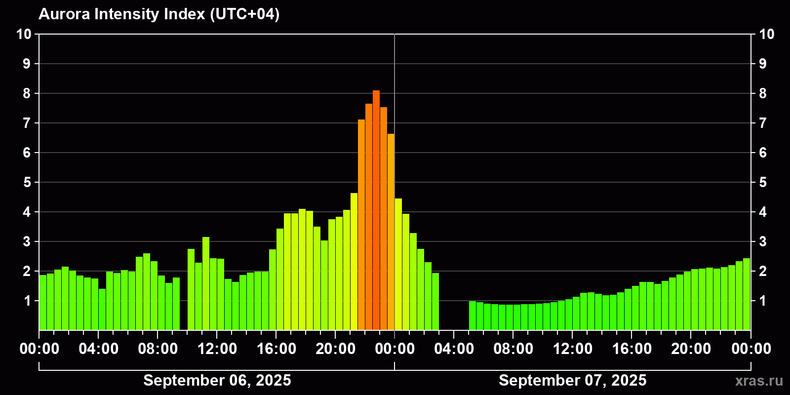 Auroral intensity index and the theoretically possible latitude of observations for nighttime in the Estern Hemisphere as of 2025-09-08 00:55 (end of day) local time